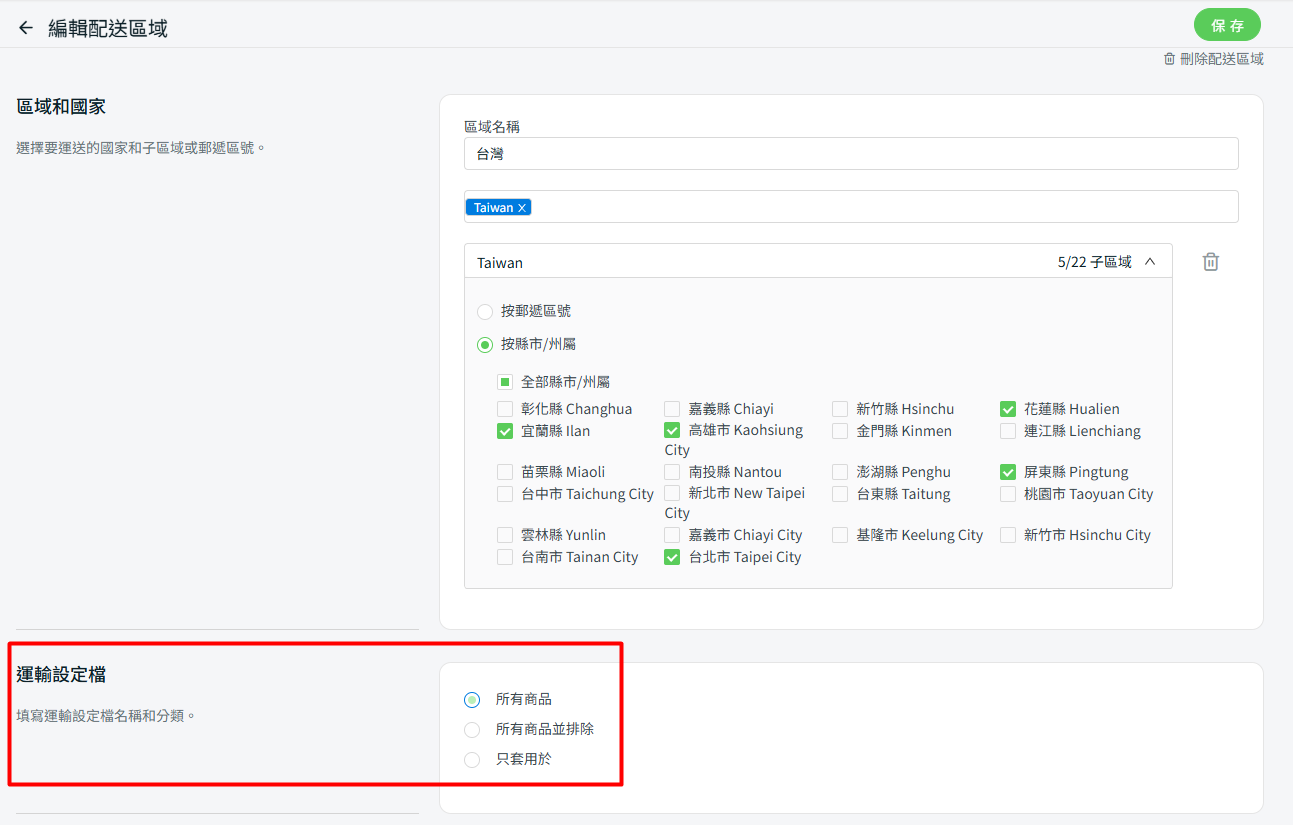 步驟二:前往台灣本島的運輸方式 > 在運輸設定檔下,設置所有商品並排除 > 保存。