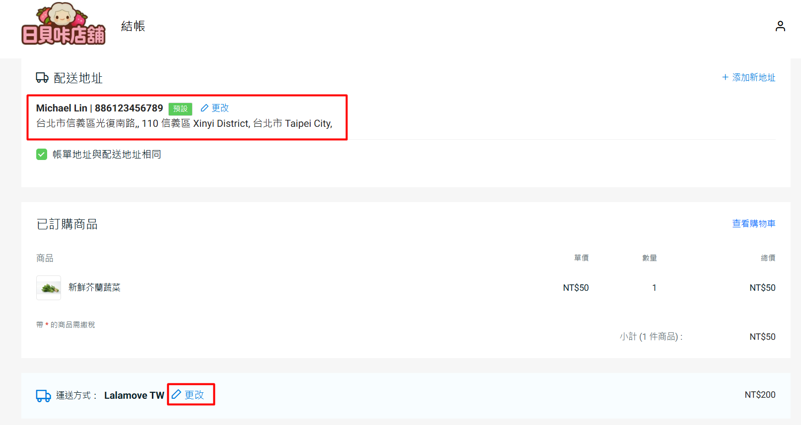 當客戶結帳時購買冷藏商品 (台北市內) 運輸設定檔的商品並提供台北市收貨地址時,系統將採用 Lalamove 快遞服務作為運輸方式。客戶可點擊更改以選擇運送方式。