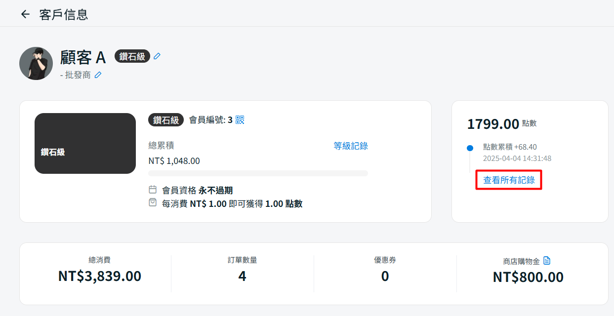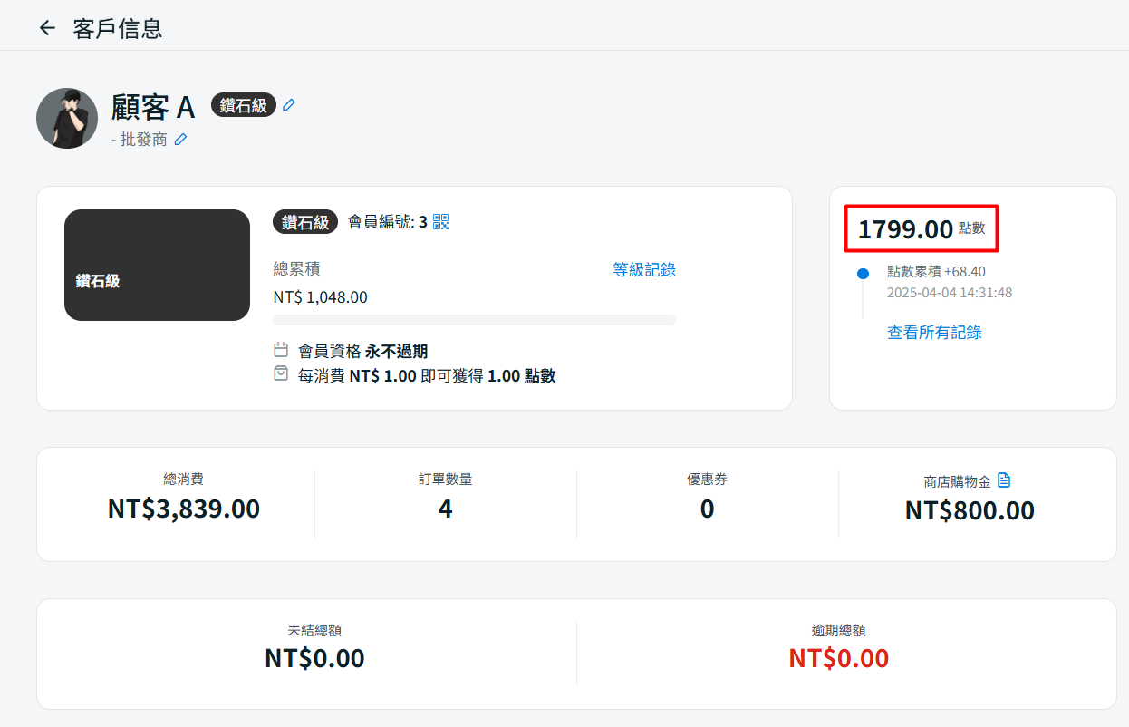 步驟四:在客戶信息下,您可以查看客戶累積的點數。