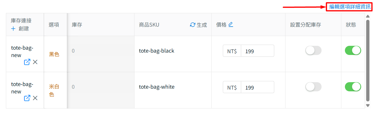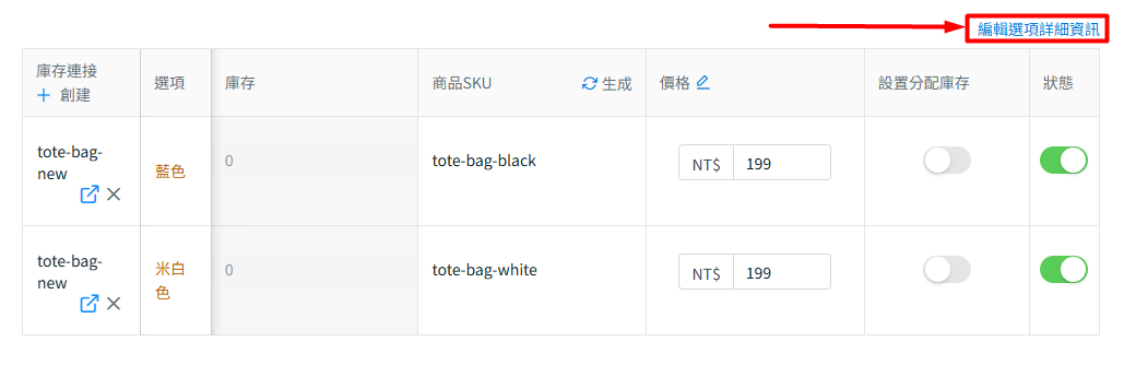 步驟三:若商品包含規格,請下滑至規格區塊 > 點擊編輯選項詳細資訊> 刪除折扣價格與促銷日期 > 點擊保存。