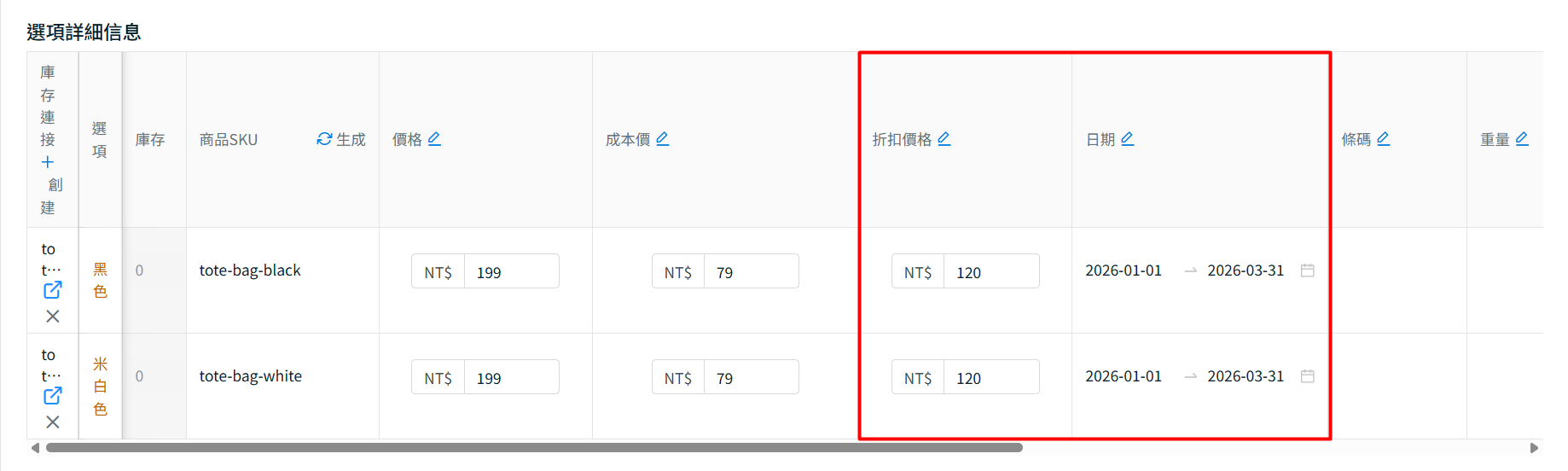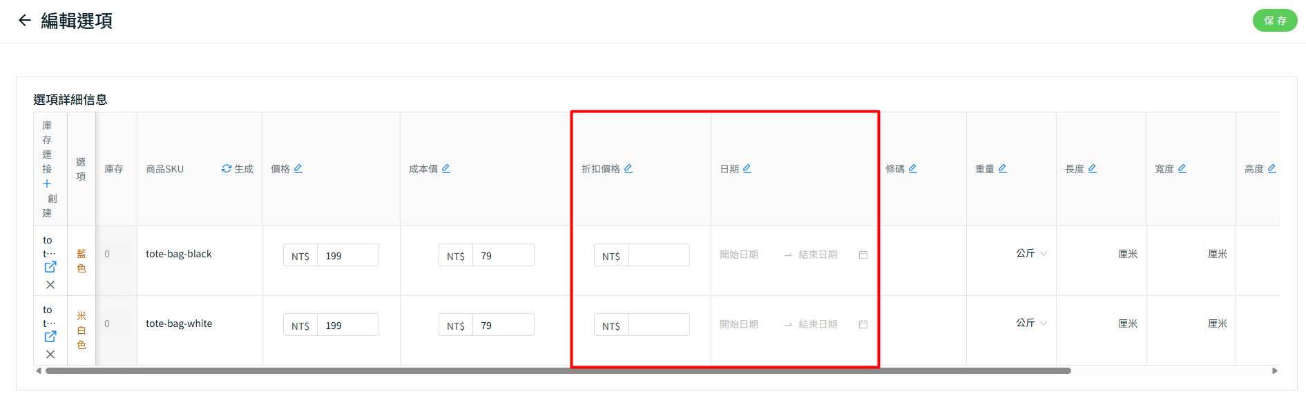 步驟三:若商品有規格,請下滑至規格區塊 > 點擊編輯選項詳細資訊> 設置折扣價格與促銷日期(若為長期促銷可留空)> 點擊保存。