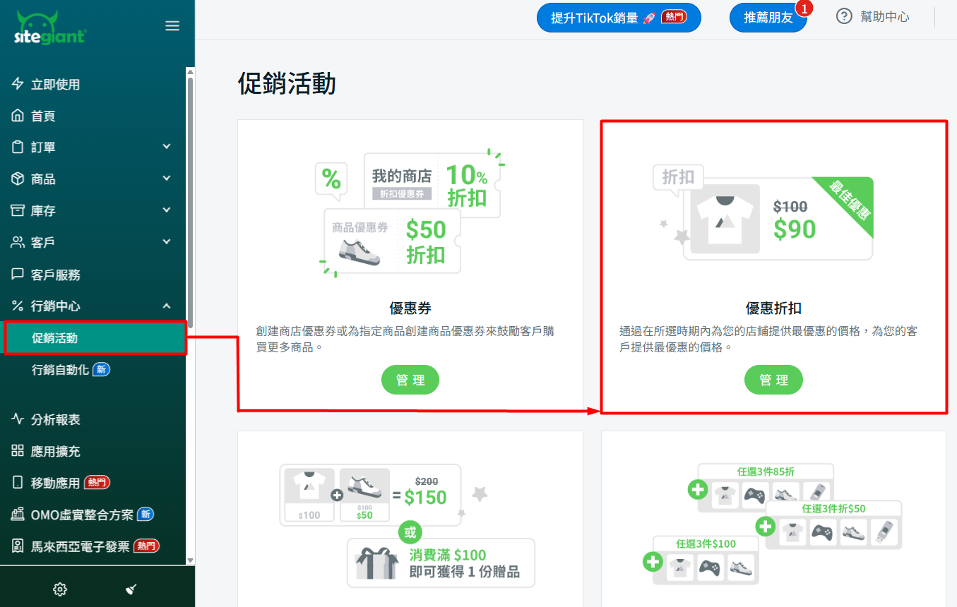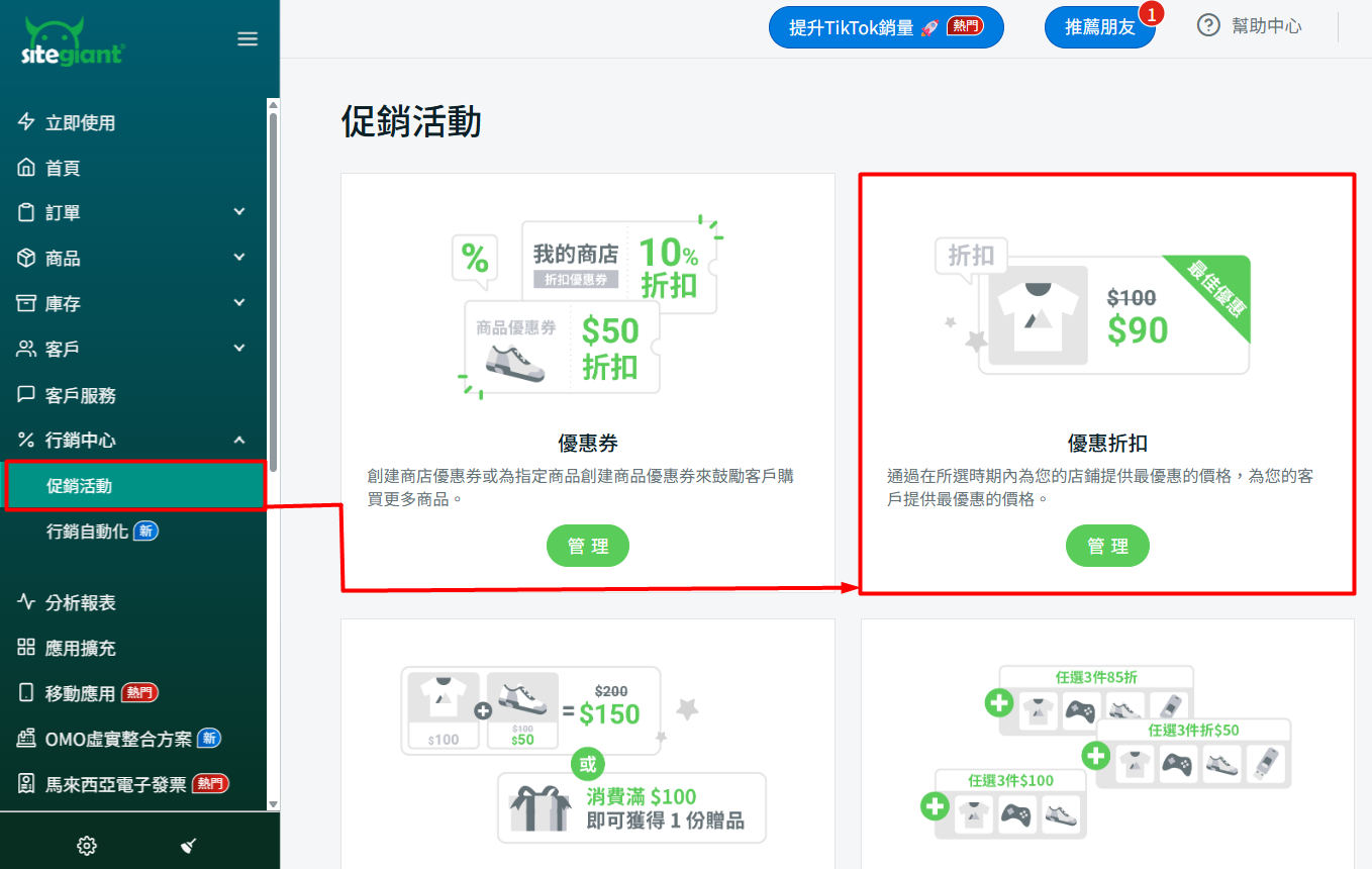 步驟一:前往行銷中心 > 促銷活動 > 優惠折扣。