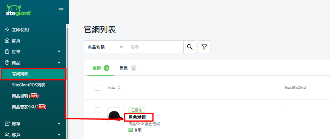 步驟一:前往商品 > 官網列表 > 點擊商品名稱。