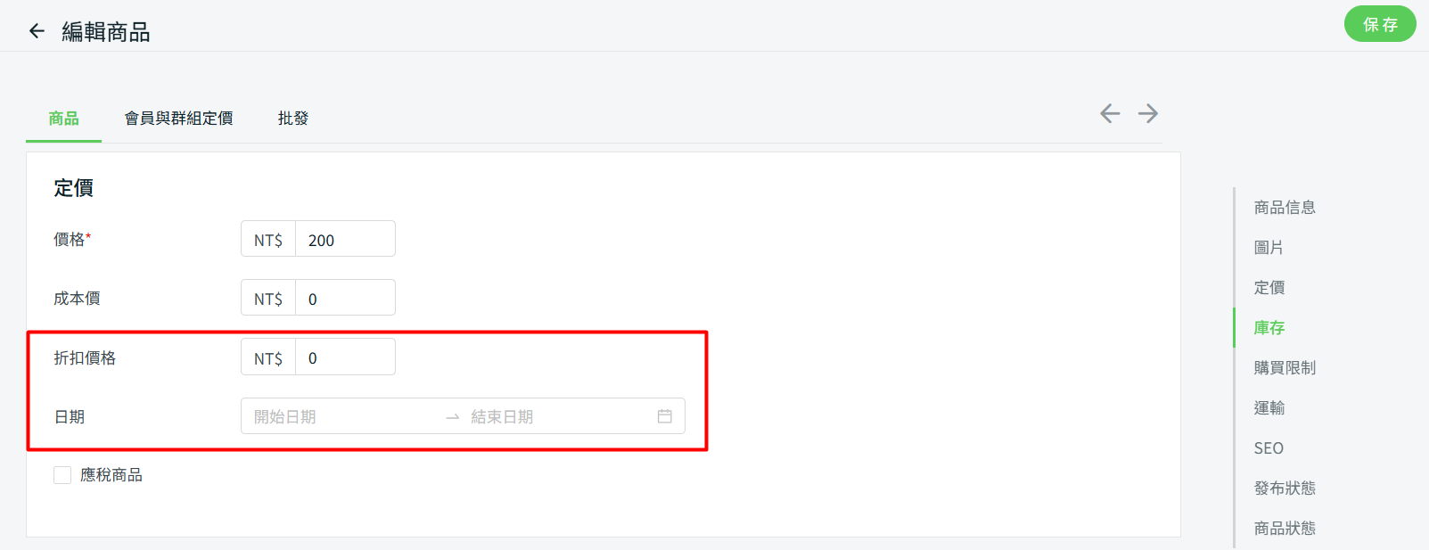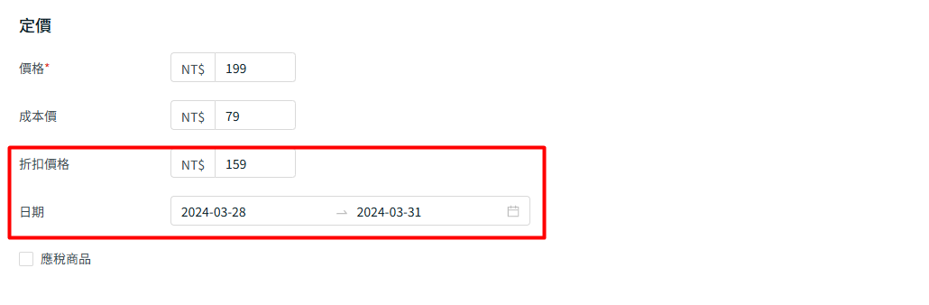 步驟二:找到定價部分,填寫折扣價格並設置促銷日期(長期促銷則留空)> 保存。