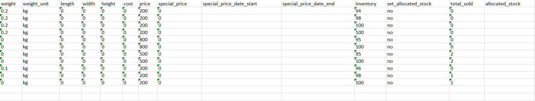 步驟三:下載並開啟 Excel 文件 > 將 special_price 欄位更新為 0 > 刪除 special_price_date_start 與 special_price_date_end 的日期 > 保存 Excel 文件。