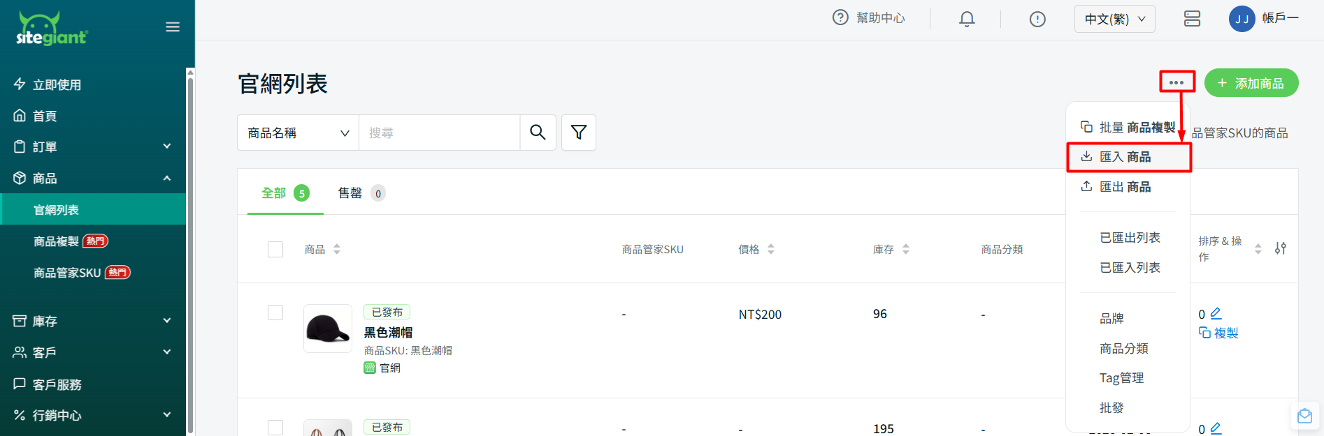 步驟四:返回官網列表 > 點擊更多(…)> 匯入商品。