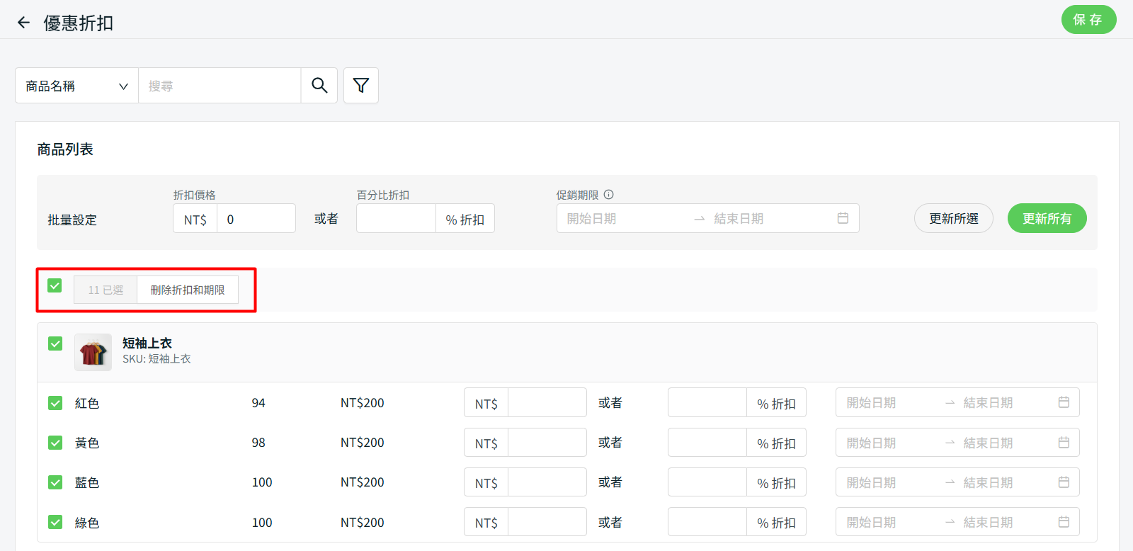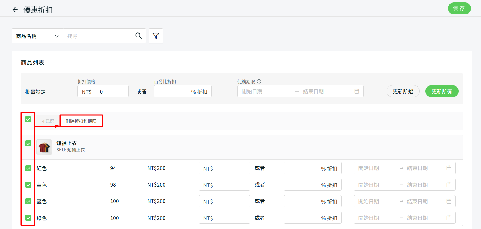 步驟五:您可批量勾選商品並批量刪除折扣和期限 > 點擊保存。