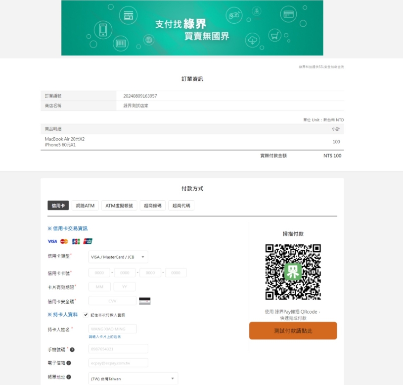 步驟二:如果頁面導向至綠界科技 ECPay 付款頁面,則表示您已成功串接了綠界科技 ECPay。