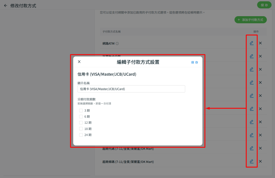 步驟六:點選好子付款方式後,點擊操作按鈕進行相關設置 > 保存。