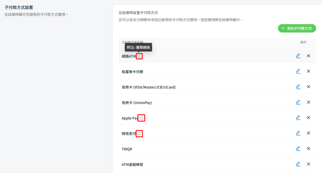 步驟五:若該子付款方式僅支援網頁或手機,系統會顯示相應圖標。您可將游標懸停於圖標上,即可查看相關信息。