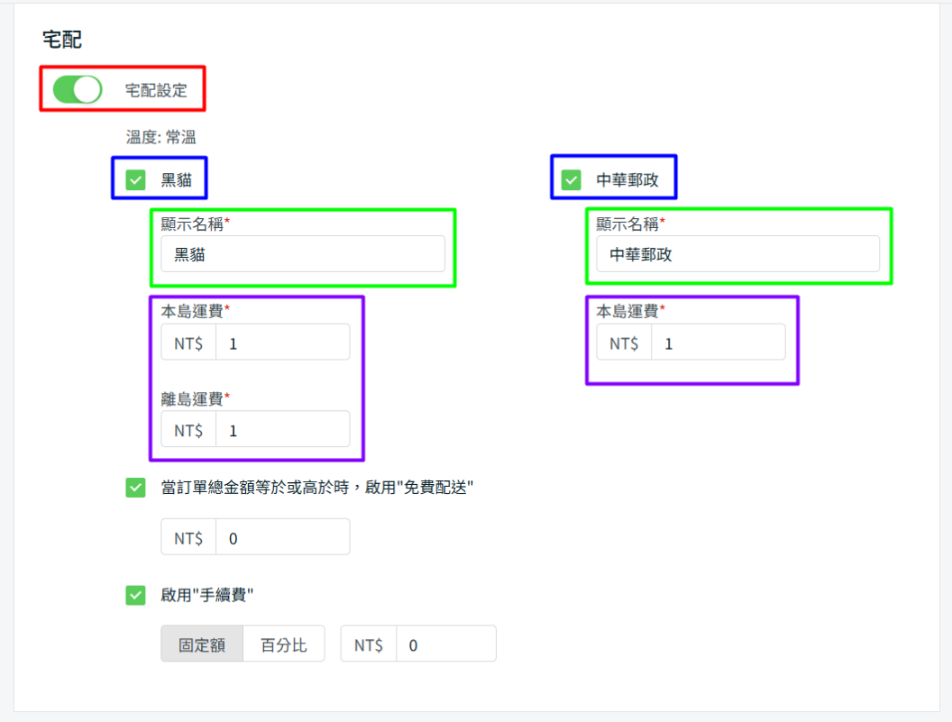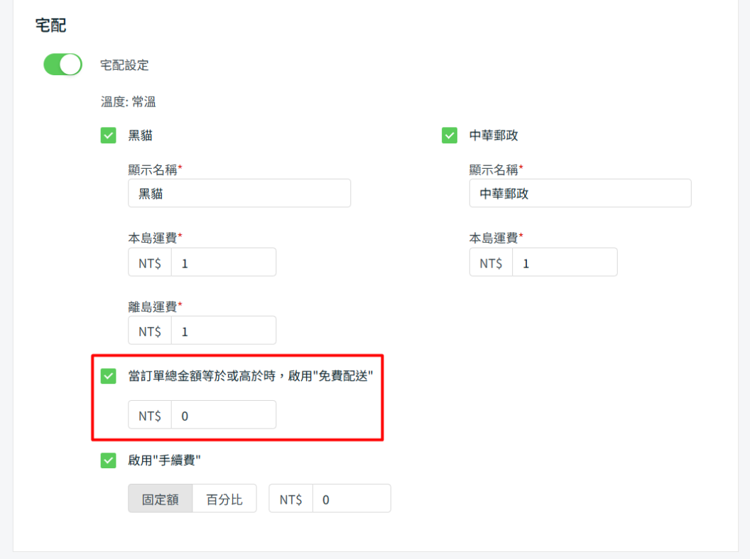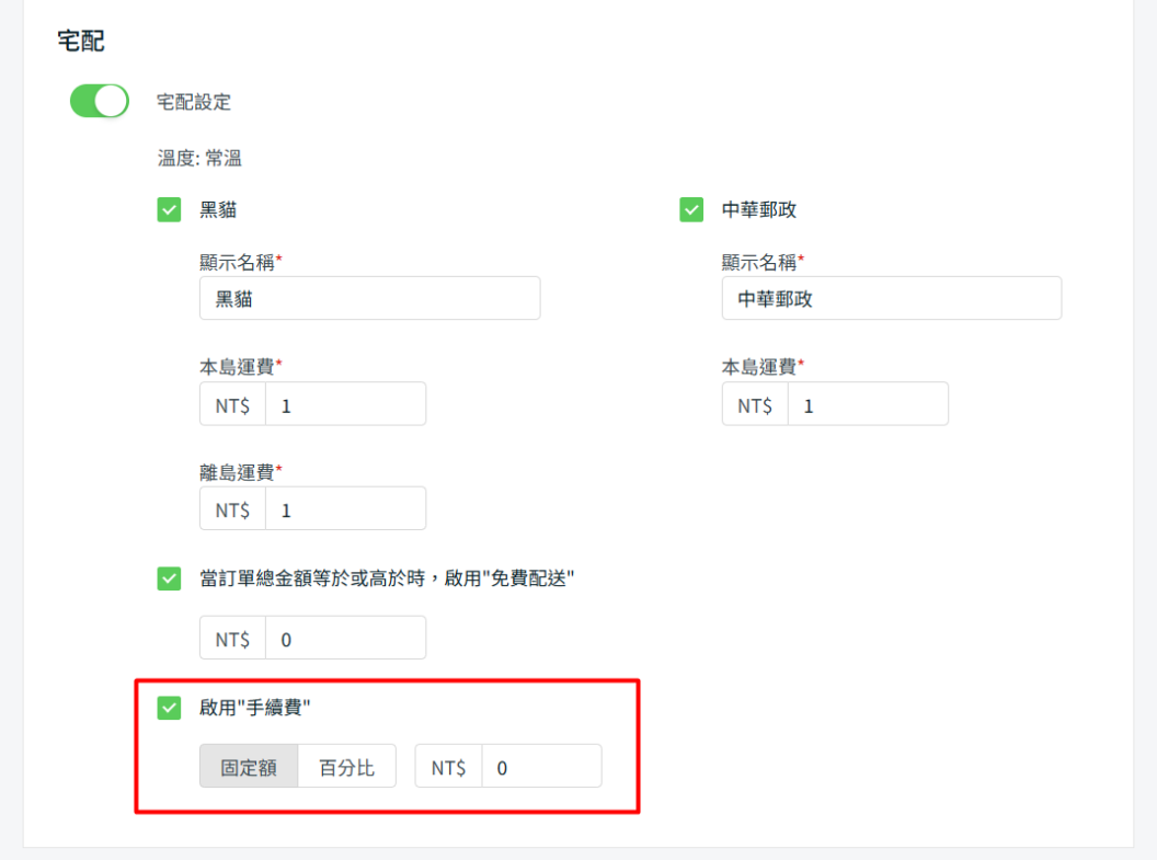 步驟一:啟用宅配設定 > 勾選供客戶選擇的快遞服務 > 輸入在結帳頁面顯示的快遞名稱 > 設置本島運費與離島運費。