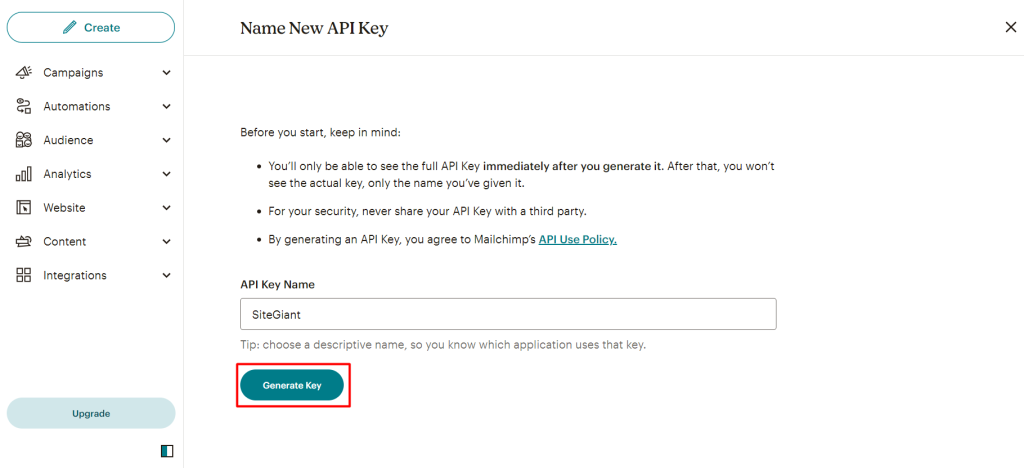 步驟四:設置 API Key Name > 點擊 Generate Key