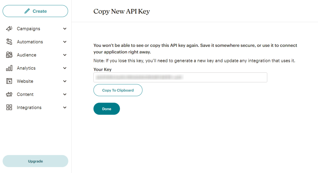 步驟五:複製 API Key 以供後續使用 > 點擊 Done