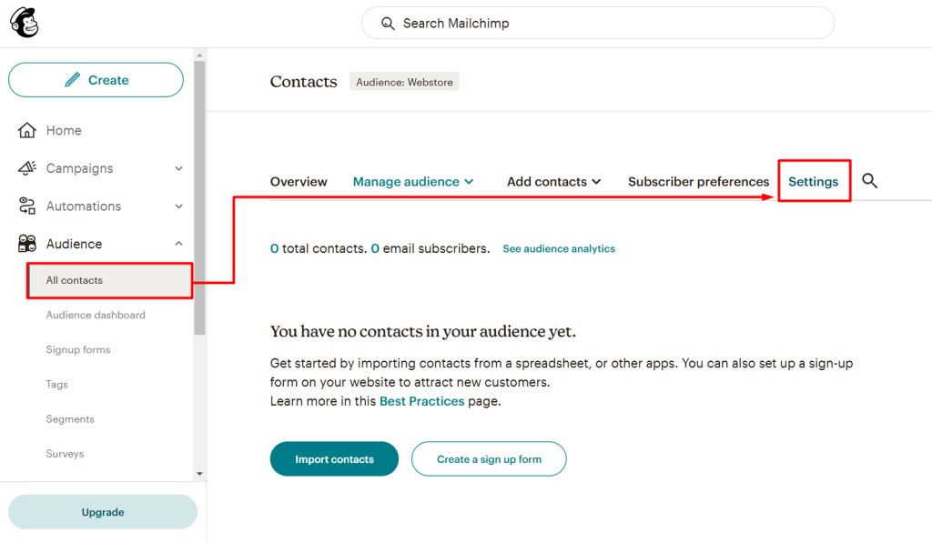 步驟六:前往 Audience > All contacts > 點擊 Settings