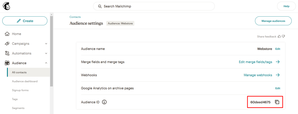 步驟二:將 API Key 及 Audience ID 粘貼到相應的欄位中 > 保存