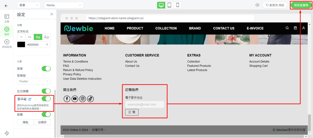 步驟三:找到元素部分 > 啟用電子報狀態 > 電子報訂閱表單將出現在頁尾 > 保存並發布。