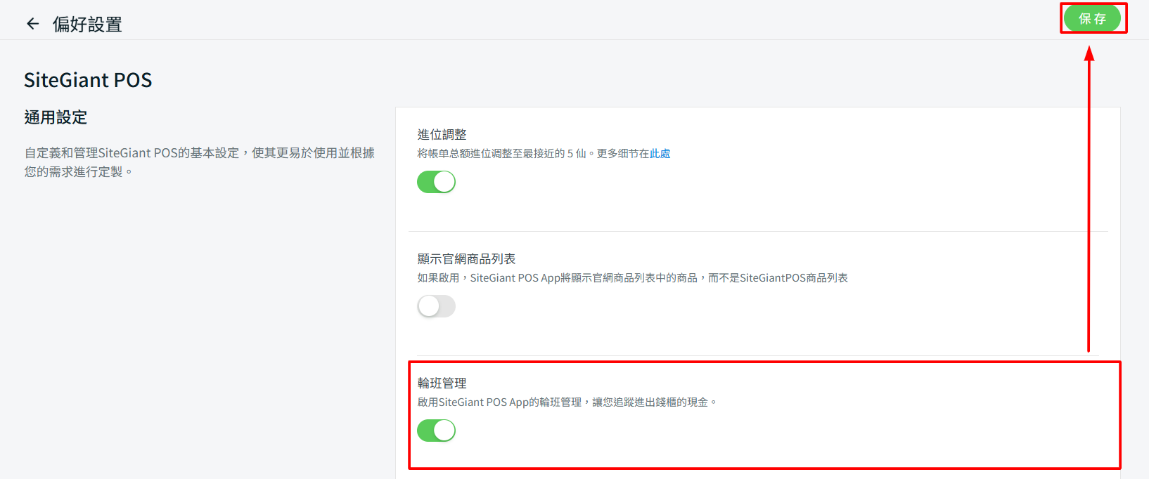 步驟一: 登入 SiteGiant 帳戶 > 前往側邊選單中的 SiteGiant POS 通路 > 選擇 SiteGiant POS > 偏好設置。