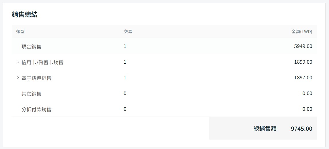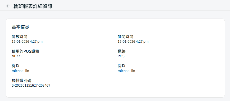 步驟三: 輪班報表詳情包括開班與結班時間、錢櫃交易,以及銷售總結(可查看付款方式詳情)。
