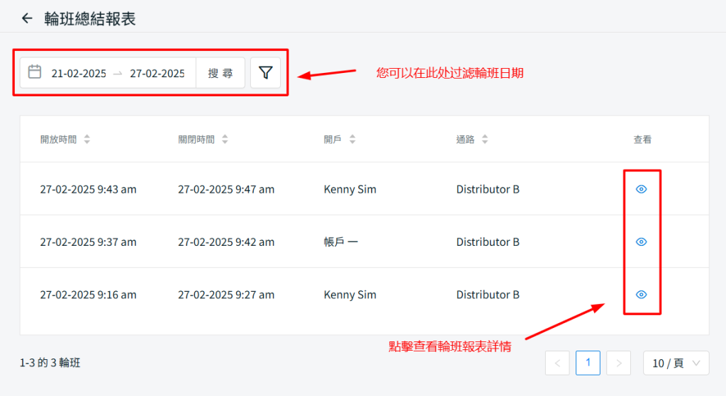 步驟二: 點擊查看圖標以查看輪班報表詳情。