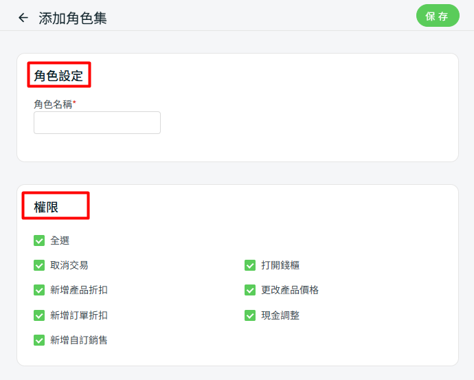步驟三: 在角色設定中輸入角色名稱,勾選欲授予員工的權限 > 點擊保存。