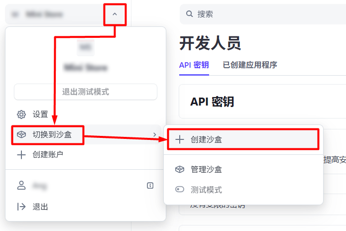 步驟三:點擊左上角的帳戶下拉選單 > 選擇切換到沙盒 > 點擊創建沙盒。