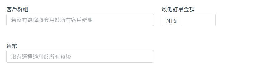 步驟六:選擇可使用該付款方式的客戶群組(如果沒有選擇,則將適用於所有客戶群組) > 填寫需要達到的最低訂單金額以使用該付款方式 > 選擇貨幣