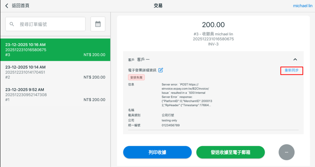 步驟三:若該訂單的電子發票安排失敗, 可點擊重新同步按鈕以重新提交。