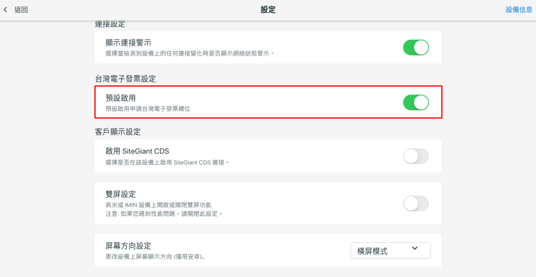 1. 若想預設啟用申請台灣電子發票欄位,可前往個人檔案 > 設定 > 台灣電子發票設定 > 預設啟用