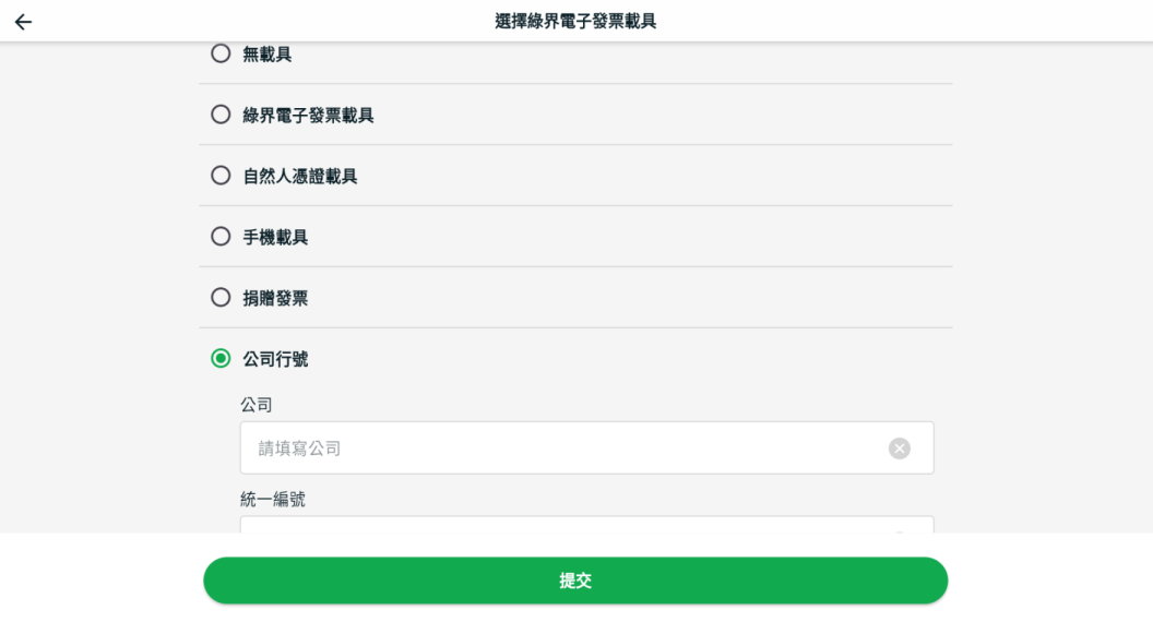 步驟二:選擇客戶所使用的載具類型 > 輸入相關資訊 > 點擊提交