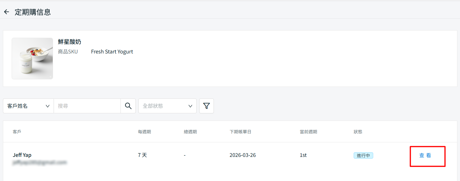 步驟二:您可以查看客戶的定期購信息>點擊查看按鈕以檢視定期購詳細資訊。