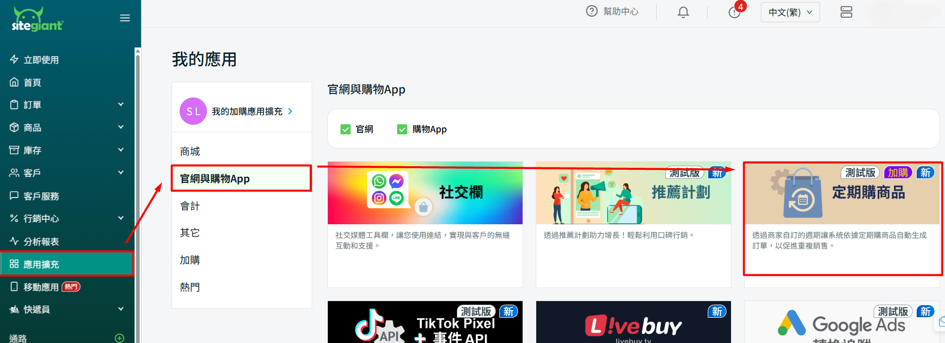步驟一:在側邊欄選單中前往應用擴充>官網與購物App>定期購商品。