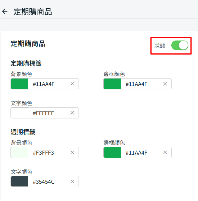 步驟二:啟用定期購商品狀態>設置定期購標籤與週期標籤的顏色。