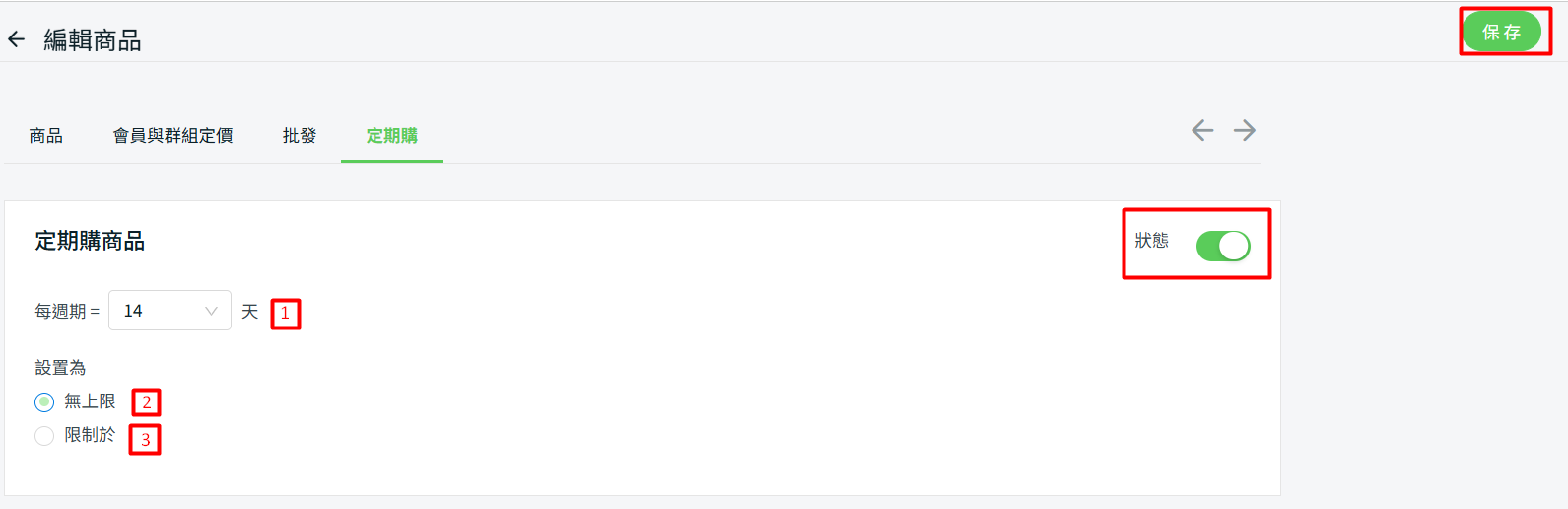步驟二:啟用定期購商品狀態>設置定期購商品相關設定>點擊保存。