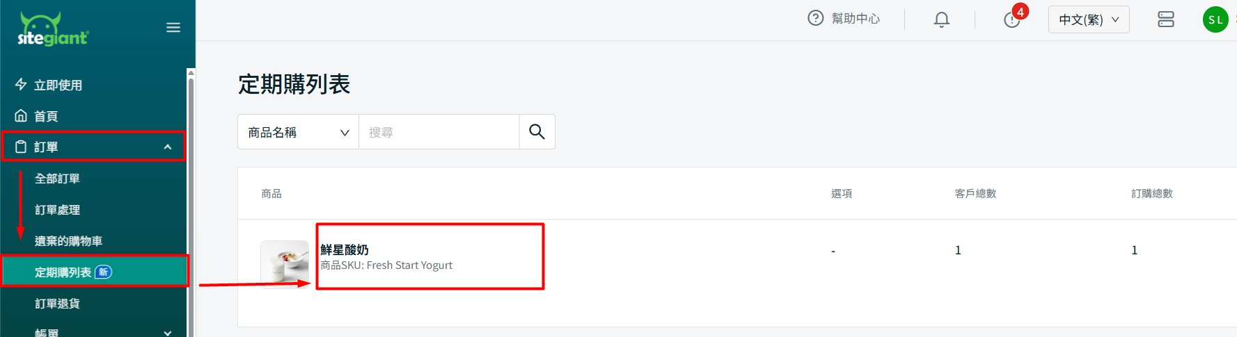 步驟一:在側邊欄選單中前往訂單>定期購列表>點擊進入列表。