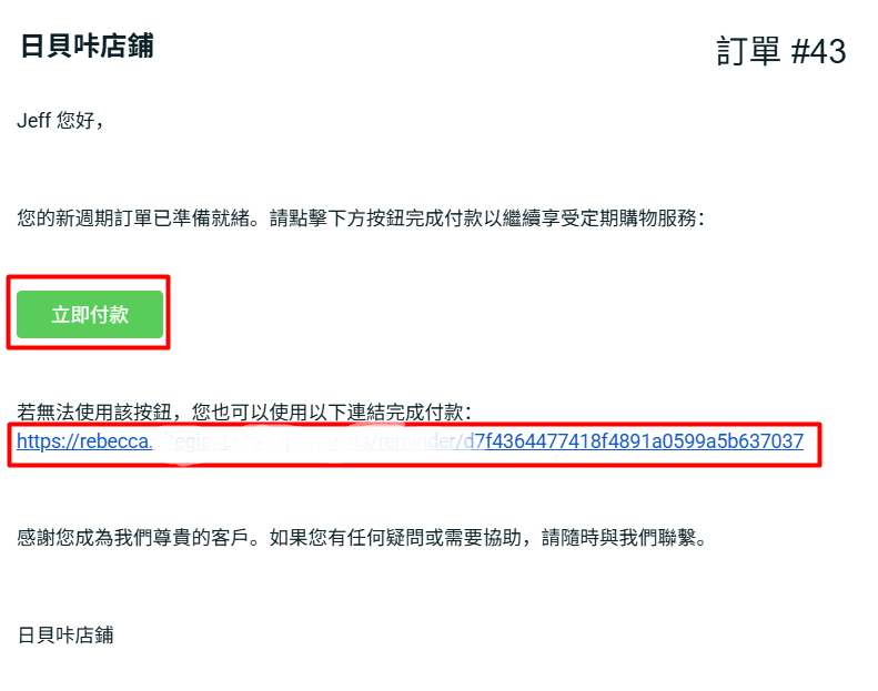 步驟一:當新的計費週期開始時,客戶將收到通知電子郵件,內容依照您在設定>電子郵件模板>定期購新週期付款連結 中設置的模板寄出。客戶可點擊立即付款按鈕或提供的連結,前往官網進行付款。