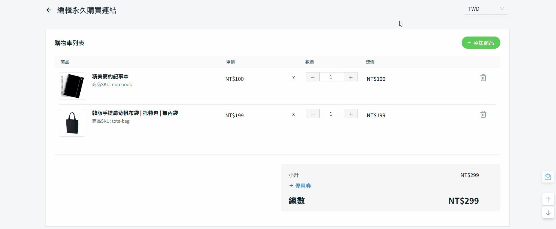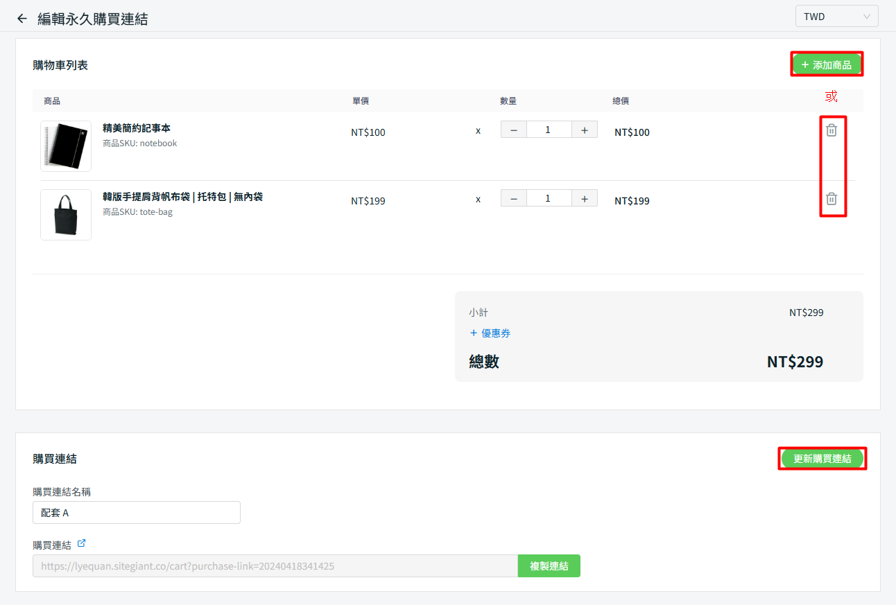 步驟二:您可以添加或刪除商品 > 完成後,點擊更新購買連結。