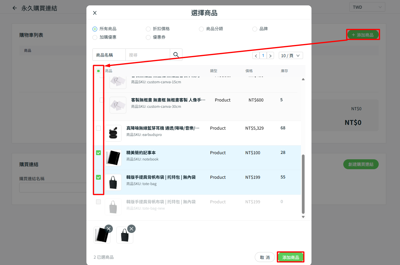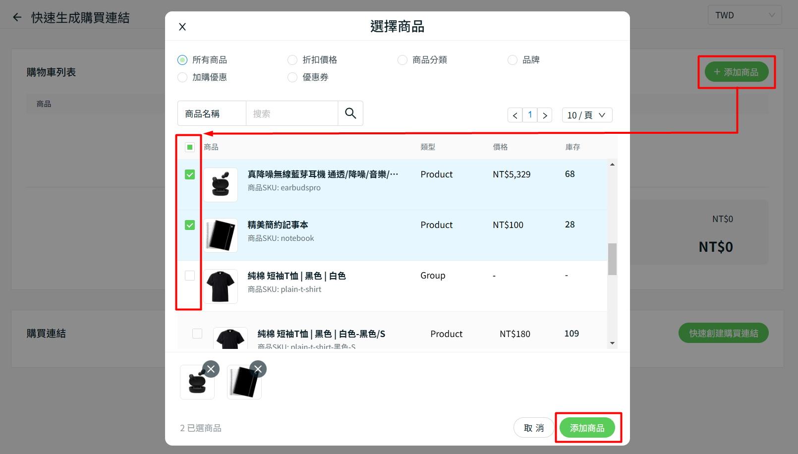步驟二:按 + 添加商品 > 選擇商品 > 點擊添加商品。